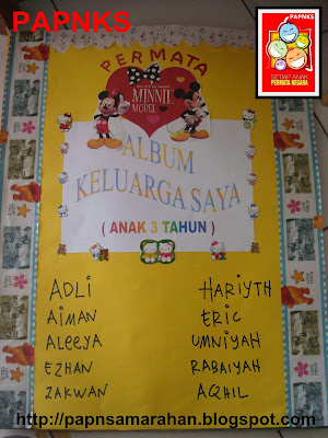Kumpulan 2 (kumpulan umur 3 tahun) memilih tema keluarga saya sebagai tema big book kumpulan mereka. Setiap keluarga anak 3 tahun menampal gambar ahli keluarga masing-masing di ruangan keluarga mereka.